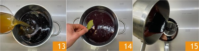 Add the beef broth 13, a bay leaf 14, and reduce on the stove by three-quarters; you should achieve a sauce that's neither too liquid nor too dense. Strain again 15.