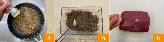Season with salt and pepper 4 and cook on high heat until they dry out. Transfer them to a bowl 5 and let them cool completely. Take the filet and season with salt 6.