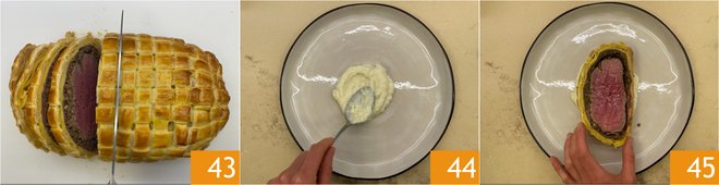 Once out of the oven, let the filet rest for a few minutes before slicing it 43. Plate by spreading mashed potatoes on the base of the plate 44, then lay the filet slice on top 45.