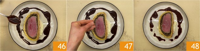 Finish with the red wine sauce 46 and a pinch of Maldon salt 47. Your Beef Wellington is ready to be served 48!