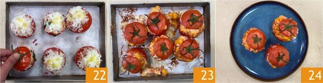 Take the emptied tomatoes and place them in a baking dish lined with parchment paper, then fill them with the mixture until forming a dome 19. Garnish the top with the reserved Pecorino 20 and a drizzle of oil 21.