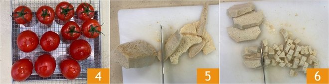 Turn the tomatoes upside down on a rack 4 and let them rest so they lose excess liquid. Meanwhile, continue with the rest of the recipe: remove the crust from the bread 5 and cut the bread into cubes 6.
