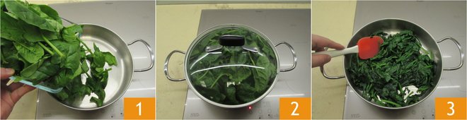 To prepare the green spaghetti alla chitarra with cacio e pepe, start with the dough: in a pan, place the washed spinach 1, cover with a lid 2, and let them wilt for about 5 minutes, or until softened 3.