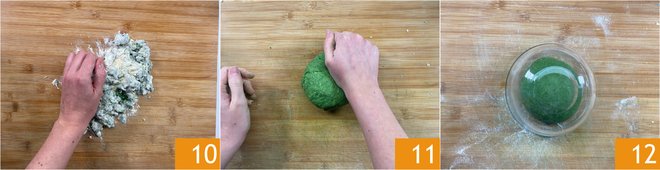 Transfer the dough to a floured surface 10 and knead energetically for about 10 minutes 11 until you get a smooth and homogeneous dough. Form a dough ball, cover it with the bowl, and let it rest for 30 minutes 12.