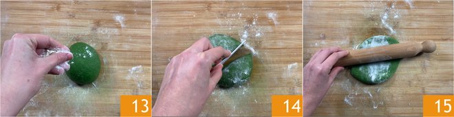 Take the dough ball and place it on the floured surface 13, cut off 1/3 using a dough scraper or a knife 14. Keep the rest of the dough covered to prevent it from drying out. Roll the dough ball with a rolling pin 15.