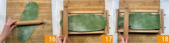 You need to get a rectangular sheet with a thickness of 1/12 inch (2 mm) 16. Try to make a rectangle that fits the size of your chitarra. Now lift the pasta by rolling it around the rolling pin and unroll it onto the chitarra 17. Roll the rolling pin over the pasta, pressing firmly to cut the sheet with the strings and thus obtain the typical spaghetti 18. Continue this way with the rest of the dough.