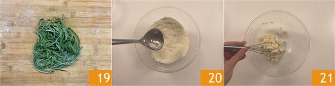 Form a nest with the spaghetti alla chitarra, lightly flouring them, then set them aside at room temperature 19. Meanwhile, bring water to a boil for cooking the spaghetti. Now prepare the cacio e pepe sauce: in a bowl, add the finely grated Pecorino Romano cheese, add a ladle of pasta cooking water 20, and mix vigorously with a whisk 21 or a spatula. You should get a smooth and lump-free paste. Cook the spaghetti in boiling water for 2-3 minutes.