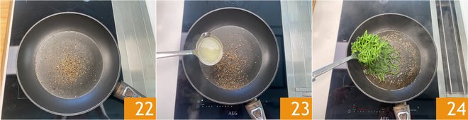 Now grind the black pepper in a pan and toast it for a few moments to intensify its aromas and flavors 22. Add a ladle of pasta cooking water 23 and drain the spaghetti into the pan 24.