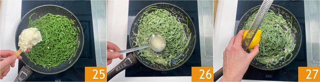 Let the pasta cook for another minute, then turn off the heat and add the Pecorino paste 25. Adjust the consistency with a ladle of pasta cooking water and mix 26. Finish with grated lemon zest 27.
