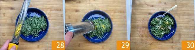 Serve the green spaghetti alla chitarra with cacio e pepe, garnishing the plates with more lemon zest 28 and ground black pepper 29. Enjoy them hot and creamy 30!