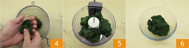Squeeze them well by pressing them on a colander 4, then transfer them to a mixer 5 to chop them 6. Set aside; you will need 7 oz of chopped spinach.