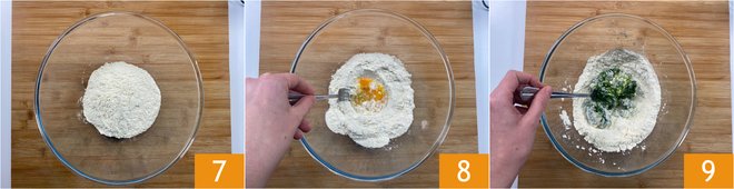 In a bowl, add the flour 7 and eggs 8, then mix with a fork to combine the ingredients 9.