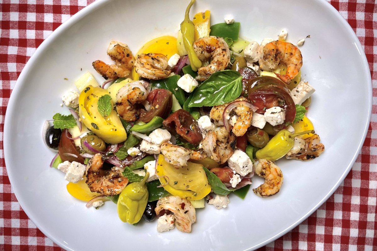 Discover the allure of the Mediterranean with this very famous, classic salad: grilled shrimp salad. It’s light, fresh, and bursting with flavors. Featuring perfectly grilled shrimps seasoned with garlic and Italian herbs, this classic dish harmonizes with juicy tomatoes, crisp cucumber, zesty red onion, refreshing green bell pepper, briny Kalamata olives, and creamy feta cheese. Drizzled with a tangy dressing of extra-virgin olive oil, red wine vinegar, and oregano, each mouthful is a burst of flavors. Whether as a delightful side dish or a healthy main meal option, this grilled shrimp salad brings the Mediterranean sun to your table.