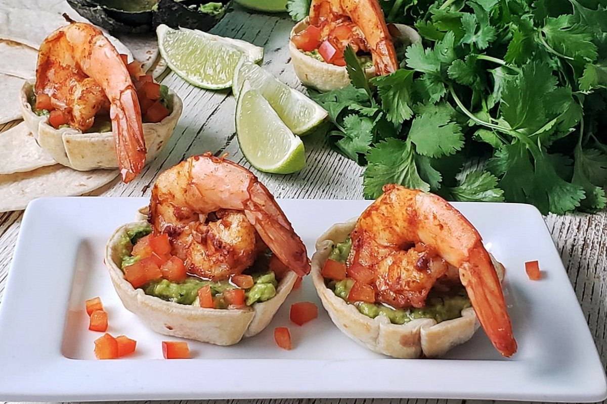 Fill each one with about 2 tbsp of the guacamole and one shrimp.