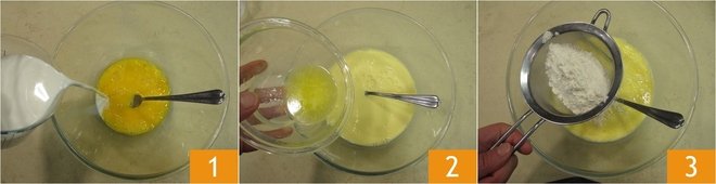 To prepare ham and cheese savory crepes, start with the batter. Gently heat the butter to melt it, then turn off the heat and let it cool slightly. Beat the eggs, pour in the milk 1 and mix. Add the cooled melted butter 2, mix again and sift in the flour 3.