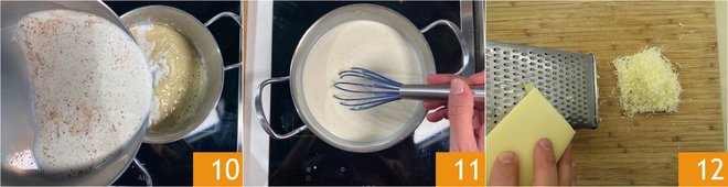 At this point, dilute the roux by first pouring in a little hot milk 10 and then all the rest. Continue stirring over low heat until you reach a thick consistency, but more liquid than usual 11. Quickly grate the Gruyere cheese, removing the rind 12.