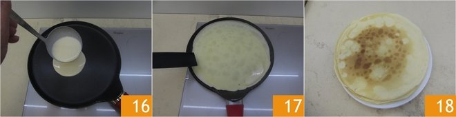 After 30 minutes, take the crepe batter out of the refrigerator. Heat a crepe maker (or alternatively a 9.5-inch non-stick pan) and grease it with a small amount of butter. Once at temperature, pour a ladle of batter sufficient to cover the surface of the pan 16: you can use a crepe spreader or rotate the pan to distribute the batter evenly. After about 1 minute over medium-low heat, you should notice a light browning, and the edges will tend to lift, so you can flip the first crepe with a spatula 17. Also, cook the other side for about 1 minute, waiting for it to color. Once the first one is cooked, transfer it to a plate. Repeat this operation until the batter is finished; you should get 10 crepes with a diameter of 9.5 inches: stack each crepe on top of the other 18.