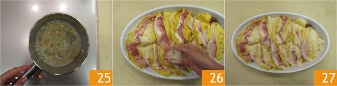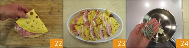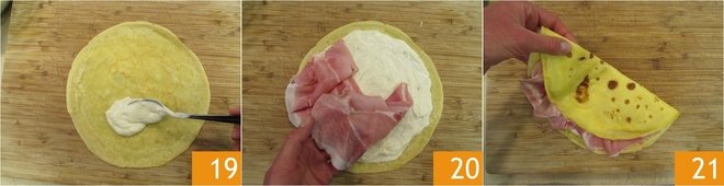 Place the crepes on a surface and, one at a time, first stuff them with the cheese béchamel 19, spreading it well over the entire surface and then with two slices of cooked ham 20. Fold them in half first 21.
