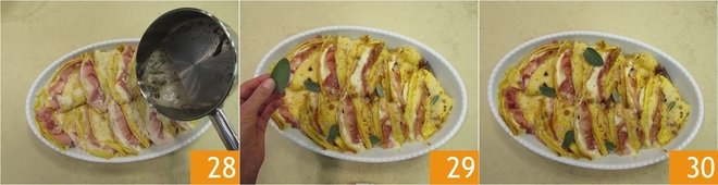 Pour the flavored butter over the crepes, distributing it evenly 28. Add more sage leaves 29 and bake in a preheated static oven at 390°F for 5 minutes 30.