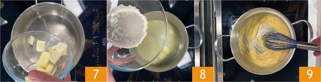 Put the butter in another saucepan 7 and melt it over low heat, then turn off the heat and add the flour all at once 8. Stir vigorously with a whisk to avoid lumps. Turn the heat back on and continue stirring until you get a golden mixture, the roux 9.