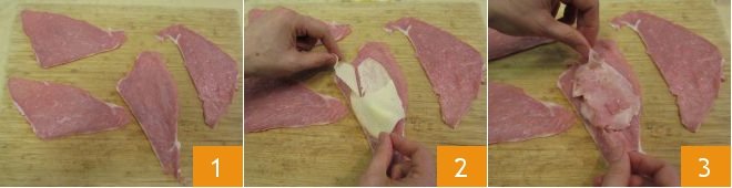 To make ham and cheese-filled veal rolls, first make sure that the slices are very thin 1, otherwise pound them with a meat tenderizer. Now stuff them with thinly sliced cheese 2 and ham 3.