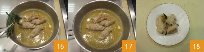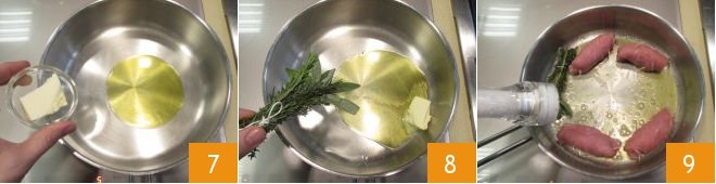 Cook: Heat the olive oil with butter in a hot pan 7. Toss in the aromatic herbs (thyme, rosemary and sage) collected in a bunch tied with kitchen twine 8. Leave to release the flavors over medium heat for 3 minutes, then turn up the heat and add the rolls. Season with salt 9.