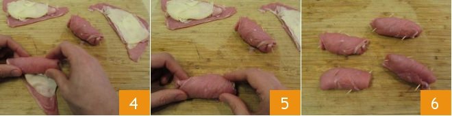 Roll the meat 4 to make the roulade 5 and seal the ends with toothpicks 6.