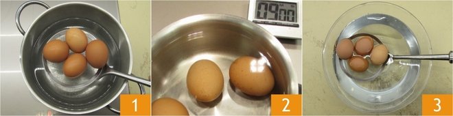 To prepare hard-boiled eggs, begin by placing the eggs in a saucepan with cold water 1; ensure the water covers the eggs. Place the saucepan on the heat and bring it to a boil, then cook for 9 minutes over medium heat 2. After this time, drain the eggs and cool them under running water or transfer them to a bowl filled with ice water 3.