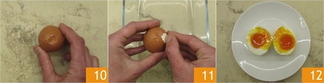 Gently tap the tip of the egg on the countertop to crack the shell 10, then carefully peel away the shell 11. Your soft-boiled eggs are now ready to enjoy as you like, perhaps with a drizzle of olive oil and a sprinkle of black pepper 12!