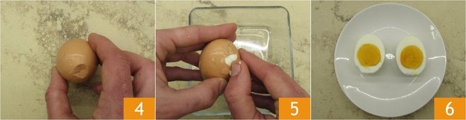 Lightly tap the tip on the counter to crack the shell 4, then gently peel off the shell 5. Your hard-boiled eggs are ready to be enjoyed however you like 6!