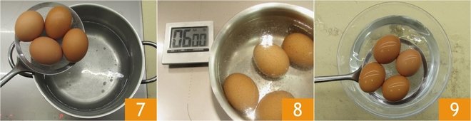 To prepare soft-boiled eggs, place a small pot of water on the stove. Once the water reaches a gentle boil, carefully add the eggs 7 and cook for 6 minutes over medium heat 8. After this time, drain the eggs and cool them under running water or transfer them to a bowl filled with ice water 9.
