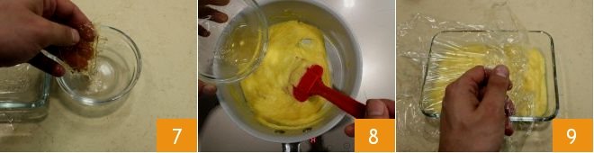 Drain and squeeze out the soaked gelatin 7 and add it to the cream while it is cooking, stirring carefully to dissolve it 8. Transfer the hot custard to a wide, shallow dish, cover it with plastic wrap, and let it cool completely at room temperature 9: this will take about two hours.