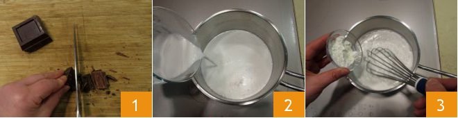 Add the dark cocoa powder 4 and continue to stir. Now add the sugar 5 and bring to the boil, stirring all the while: this will take a few minutes. Remove from the heat and last of all, add the finely chopped chocolate 6,
