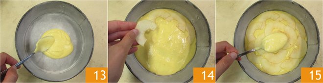 Butter and flour an 8" diameter spring mold and add 2 spoons of batter 13, then arrange a layer of apple slices on top, without overlapping them 14. Cover with another layer of batter 15 and continue to alternate layers until you finish all the ingredients.