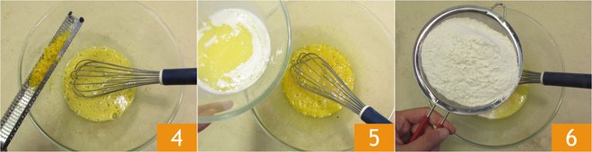 Add the grated lemon peel 4 and the warm melted butter 5, then stir some more to amalgamate. Sieve the flour directly into the bowl a little at a time 6 and stir it in.