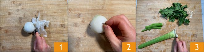 To prepare the bollito, first trim the onion 1 and stud it with cloves by inserting them into the onion so they won't float away during cooking 2. Clean the celery: don't throw away the leaves and cut the stalks into large pieces 3.