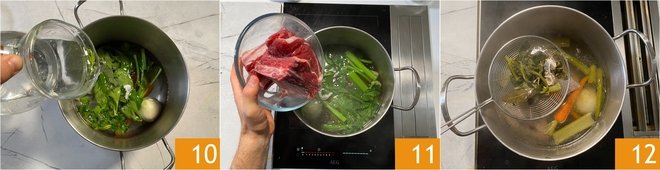 Cover with cold water 10 and bring to a boil. When the water starts boiling, season with salt to taste and immerse the pieces of meat 11. Let simmer gently for 3 hours, skimming off impurities with a skimmer. At the end of cooking remove the celery leaves and the pepper parcel as well 12.