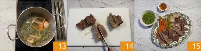 The bollito is ready 13, so drain the meat, remove the bones and cut it into pieces 14. Your bollito is ready to be served with salsa verde and mustard 15!