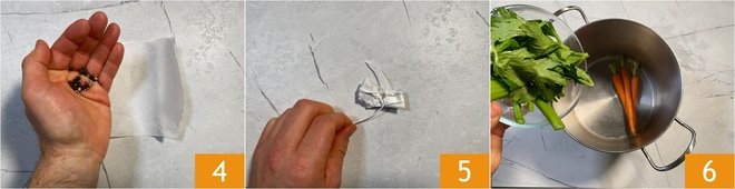 Place the peppercorns on a small sheet of parchment paper 4, fold it into a little parcel and tie it with kitchen twine 5. At this point put everything into a large pot: the carrots with their skins (after removing the tops), the celery stalks and leaves 6.