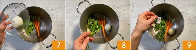 Add the studded onion 7, the parsley bunch 8 and the pepper parcel 9.