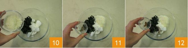 and add the grated cheese 10, salt, pepper 11, and nutmeg 12.