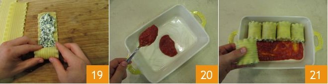 Now move on to the pasta. Place the wavy lasagna sheets into a pot containing plenty of salted water and cook until al dente 16. Then, drain them and place a tray lined with a cloth and leave to cool 17. Next, add the filling to the lasagna sheets, leaving ½ inch (1 cm) free around the edges 18,