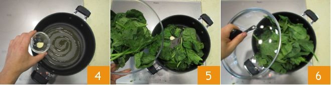 In the meantime, take another pot and heat a little more oil together with a peeled clove of garlic 4. Once this is hot, add the spinach 5 and a pinch of salt, and cover with the lid before leaving to cook for 4-5 minutes 6.