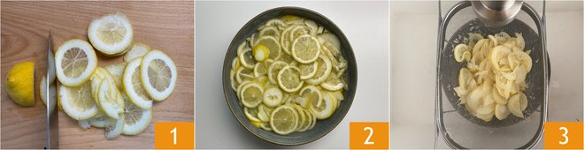 To prepare lemon marmalade first make sure to use sterilized jars and with new lids. Wash, then slice the lemons thinly, it is not necessary to remove the seeds 1. Transfer them to a large bowl and cover with cold water 2. Cover with plastic wrap and leave at room temperature for 24 hours. Rinse 3 and change the water, then repeat the resting for 24 hours.