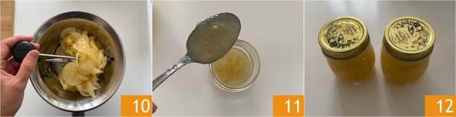 Pass the mixture through a food mill 10, so as to remove the seeds. It is not necessary to be overly thorough but this step is also necessary to somewhat uniform the consistency. Transfer the marmalade into sanitized jars 11 and proceed with the usual canning process 12.