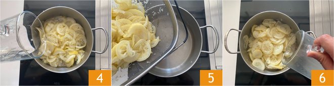 After the second resting period, rinse the lemons again and put them in a pot. Cover with water 4 and bring to a boil. Then drain the lemons and keep about 12 oz of the water in which you boiled them. Transfer the lemons back into the pot 5 and the indicated water 6.