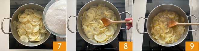 Also add the sugar 7. Bring to a gentle boil and cook, stirring often 8, for about 30-40 minutes. At this point, the slices will be quite soft and broken down, but rather uneven and abundantly syrupy 9: do not worry and especially do not cook too much because the marmalade will thicken a lot during cooling.