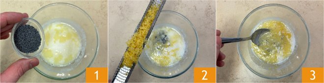 To prepare the lemon poppy seed cake, first melt the butter in a saucepan or microwave, then add the poppy seeds 1 and the grated lemon zest 2. Stir and let the mixture infuse at room temperature for a few minutes 3.