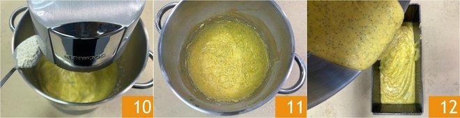 Incorporate the dry ingredients by increasing the speed again 10 and continue to work the mixture until it is well-whipped 11. Grease a 10x3.5x3-inch pan and fill it with the batter 12. Bake in a preheated static oven at 340°F for 55 minutes.
