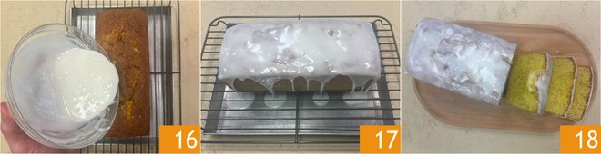 Turn the loaf upside down on a wire rack with a tray underneath, then pour the glaze over the entire surface 16, letting it drip down the sides 17. Let the glaze dry at room temperature and serve your lemon poppy seed cake 18!
